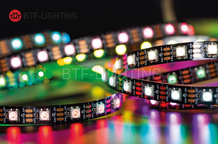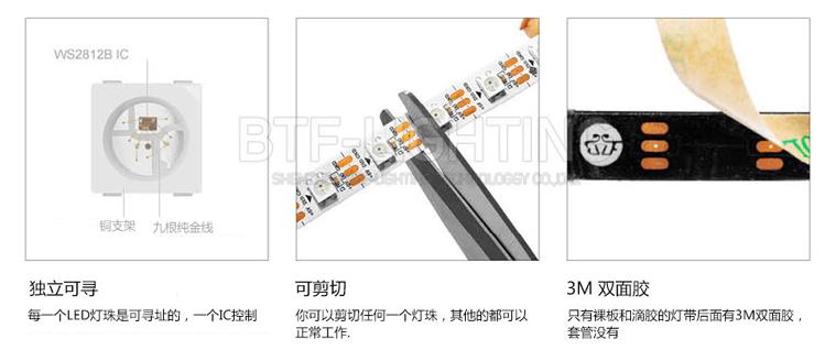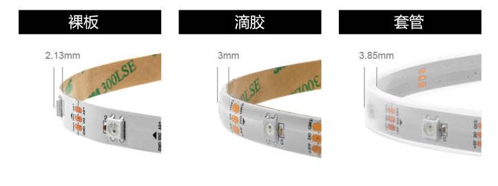 按照惯例,打开淘宝,输入 WS2812 关键词即可搜到一堆产品,如下图所示(图片来自淘宝)。其中每一个 LED 灯珠可以单独控制,一个 IC(WS2812) 驱动 1个 LED 芯片;可以根据不同的需求有不同灯珠间距可供选择,如 30灯/米、60灯/米、74灯/米、96灯/米、100灯/米、144灯/米等规格;还可以根据实际情况选择灯带的防水处理版本。
