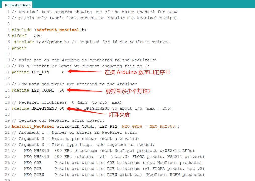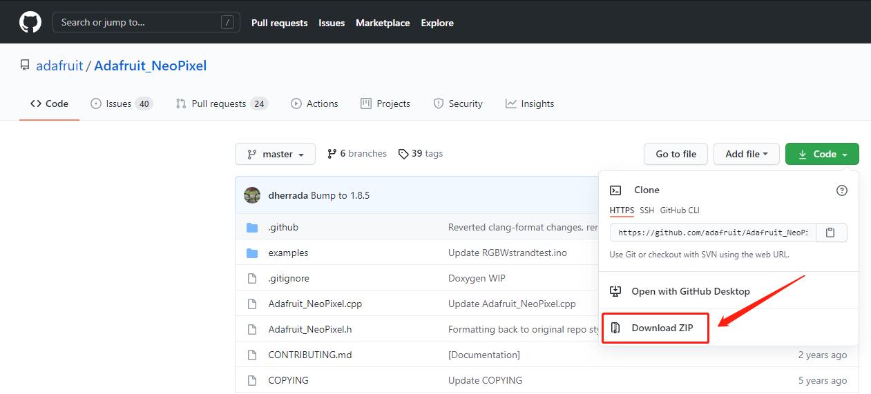 推荐 Arduino 控制 WS2812 的库文件为 Adafruit_NeoPixel ,可以通过 Github 找到该库文件,直接点击下载 zip 包,在 Arduino IDE 中安装库文件(项目 --> 加载库 )即可。--> 添加 .zip 库