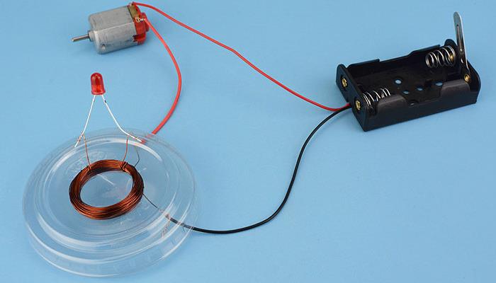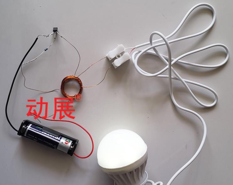 无线电能传输(led灯泡版):电池盒1个、 电池1个、发射线圈1个、 接收线圈1个、led灯泡 1个、三极管1个、电阻1个