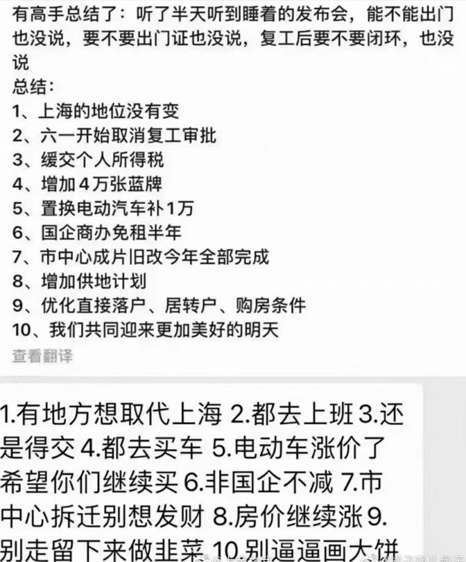 但是却又有很多迹象表明6月1日起在上海的生活方式将会发生改变:某些小区解散了志愿者、某些小区通知暗示了今天(5月30日)可能是最后一次集体核酸… 还有,在昨日(2022年5月29日),上海市人民政府发布了《上海市人民政府关于印发《上海市加快经济恢复和重振行动方案》的通知》,原文可见上方链接。有网友基本概括如下: