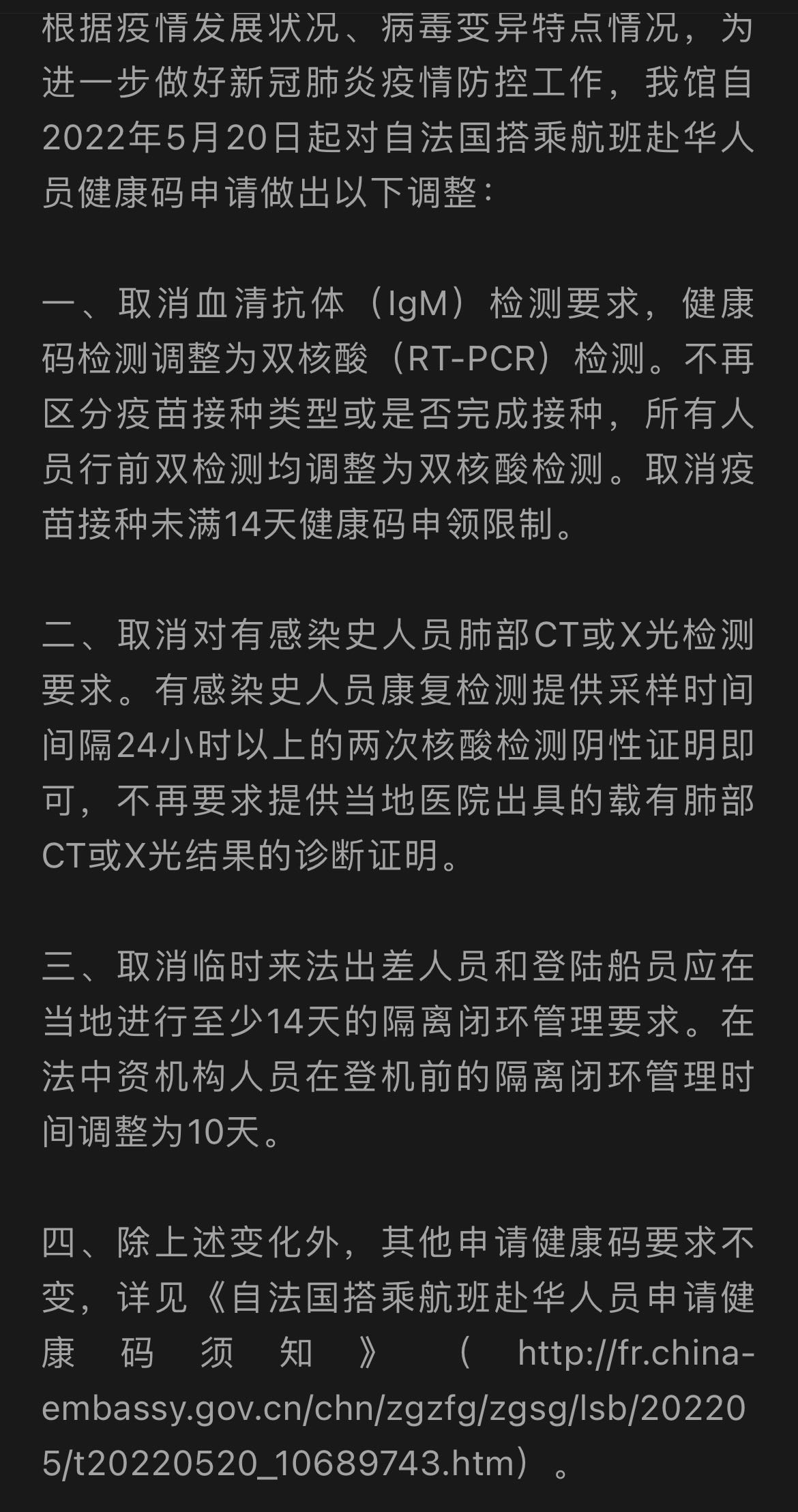 无意中翻到最新的法国赴华人员申领回国健康码的标准(下左图),现在的标准比我去年回来时更宽松(本人在去年政策最宽松的时候抵达上海)。这似乎与天天宣传的“坚持动态清零毫不动摇”的总体方针、大力发展核酸产业、增建核酸基础设施建设、“没有困难就要制造困难”的总体方向相悖(狗头)。不过从入境政策和从上海出发的返乡隔离政策中也可以看出,疫情所带来的防控措施在大方向上开始似乎变得宽松。