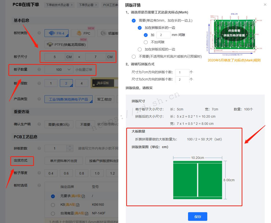 当在“PCB在线下单”页面中选择板子的数量到一定数量之后,下方将会跳出“出货方式”的选项,其中可以选择“嘉立创帮我拼版”,将过小的开发板拼成一块大板,以便进行 SMT 贴片。