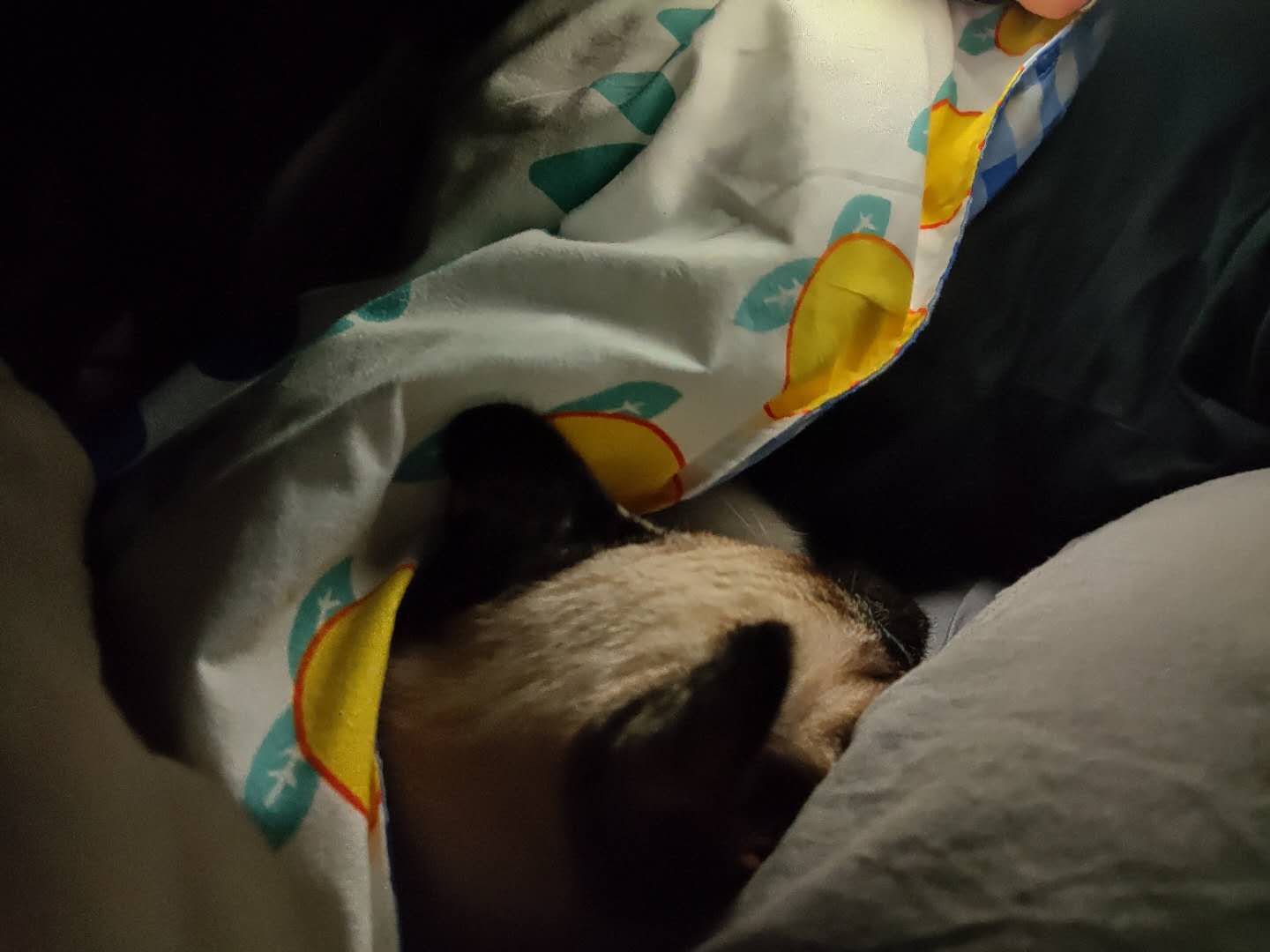 但是当天晚上就出大问题了,这只神仙猫就不让我俩睡觉😴,半夜始终夹在我们之间,偶尔睡着还算消停一点、其余时间都在和我抢枕头,没错我在和一只猫抢我的枕头。每次我刚抢到枕头,她就踩我脸、一个劲在我耳边打呼噜,在我俩床头来回行走🤣。