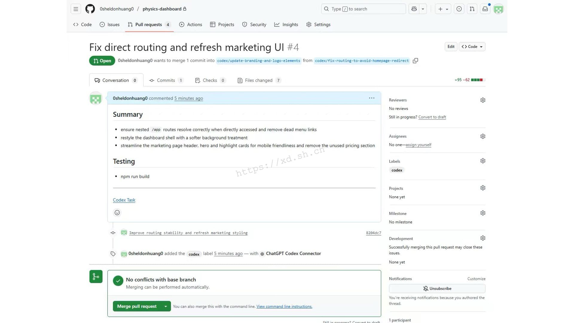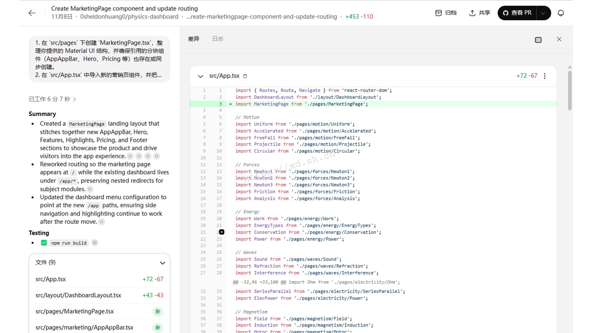 在使用 Codex 的时候,我对于我的需求描述非常简单:想把 Material UI 的模板页面移植到我的项目首页,只要打开 xd.sh.cn/pd 就能看到一个简单介绍或者是说明页面。