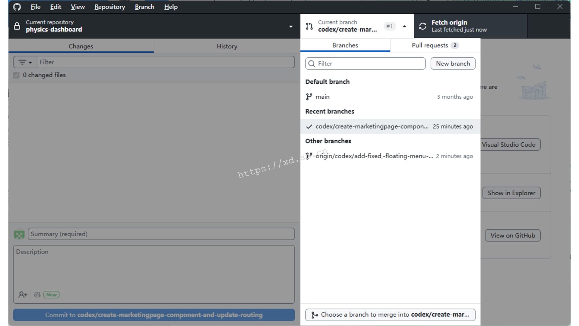 Codex 在结束之后会生成一个分支(branch),同时向你提出一个 PR(pull request)。和 Github 同步之后,在 Github 桌面端把项目的代码切换到这个分支就可以预览 Codex 刚才修改的这些代码。