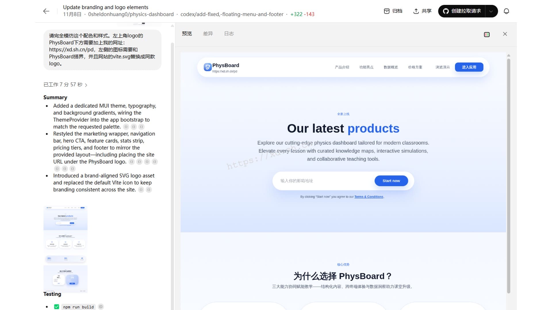 所以我给它下了道简单的指令,把 Marketing Page 作为 PhysBoard 的项目主页。有意思的是,它可能觉得我的 prompt 不太清晰,给我总结了一下: