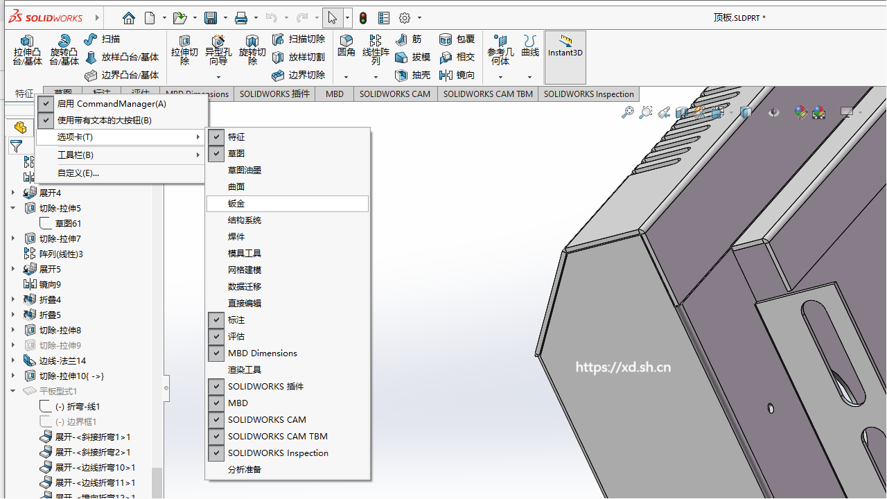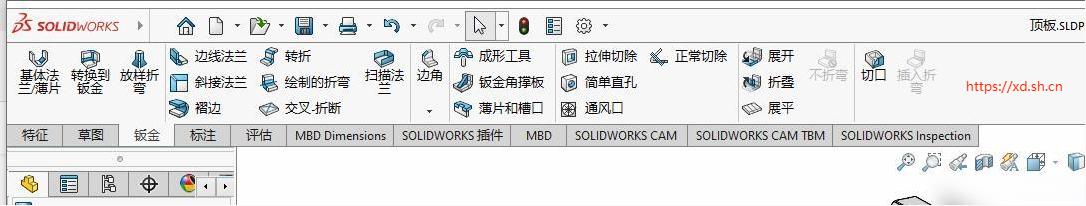 在顶端工具栏上任意一个名称上单击鼠标右键,在弹出的菜单中点击“钣金”。