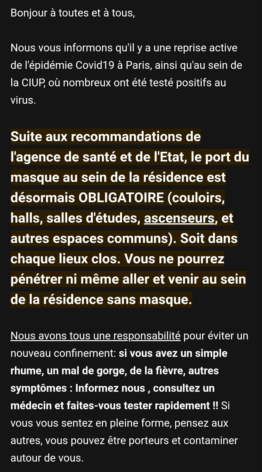 我们想通知你们的是:新冠病毒在巴黎又开始活跃了起来,包括在巴黎大学城内有许多人已被检测出阳性。