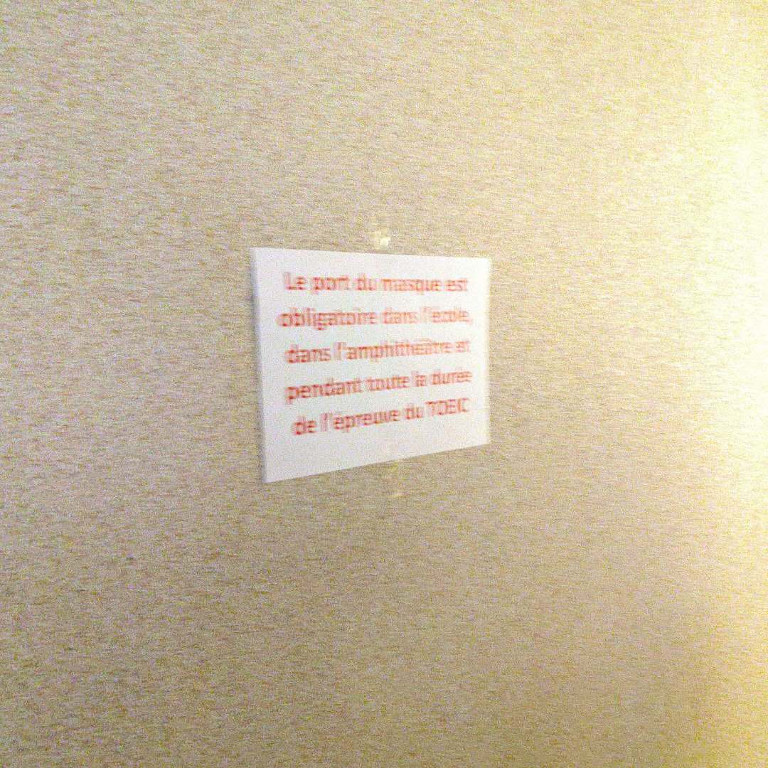 下方贴纸大意:在学校、阶梯教室和托业考试中都必须戴口罩。